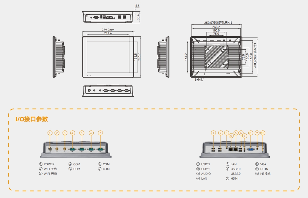 | 分辩率 | 1024*768 | 整机功耗 | <17W(屏3.2W) | 机箱材质 | 铝合金压铸 |