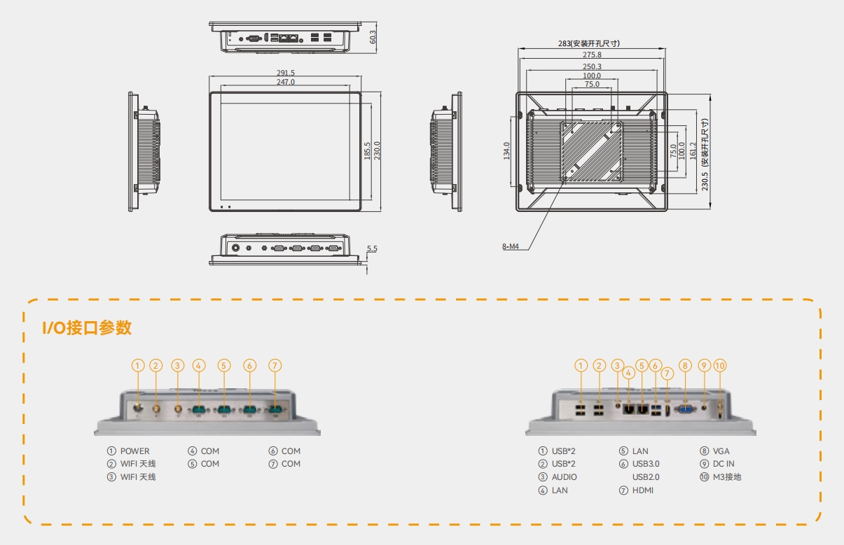 | 上I/O接口 | 1*开关 2*天线 4*COM | 1*开关 2*天线 4*COM | 1*开关 2*天线 4*COM | 1*开关 2*天线 4*COM |
