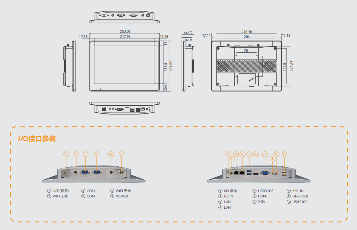 | 下I/O接口 | 1*DC IN端口 1*LAN 端口 1*USB3.0端口 3*USB2.0端口 1*VGA 1*LINE-OUT端口 1*MIC-IN端口 2*USB2.0 1*M3接地螺孔 | 1*DC IN端口 1*LAN 端口 1*USB3.0端口 3*USB2.0端口 1*VGA 1*LINE-OUT端口 1*MIC-IN端口 2*USB2.0 1*M3接地螺孔 | 1*DC IN端口 1*LAN 端口 4*USB3.0端口 1*HDMI端口 1*COM端口 1*LINE-OUT端口 1*MIC-IN端口 2*USB2.0 1*M3接地螺孔 | 1*DC IN 端口 1*LAN 端口 2*USB2.0 端口 2*USB3.0 端口 1*HDMI 端口 1*VGA 端口 1*LINE-OUT 端口 1*MIC-IN 端口 2*USB2.0 1*M3接地螺孔 |