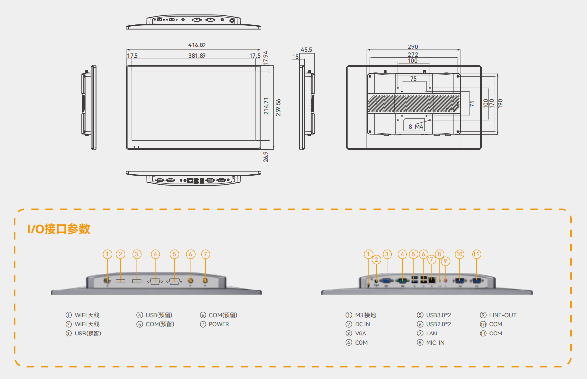 产品型号PPC-1711指示灯屏下预留电源状态指示灯整机尺寸417x260x46mm