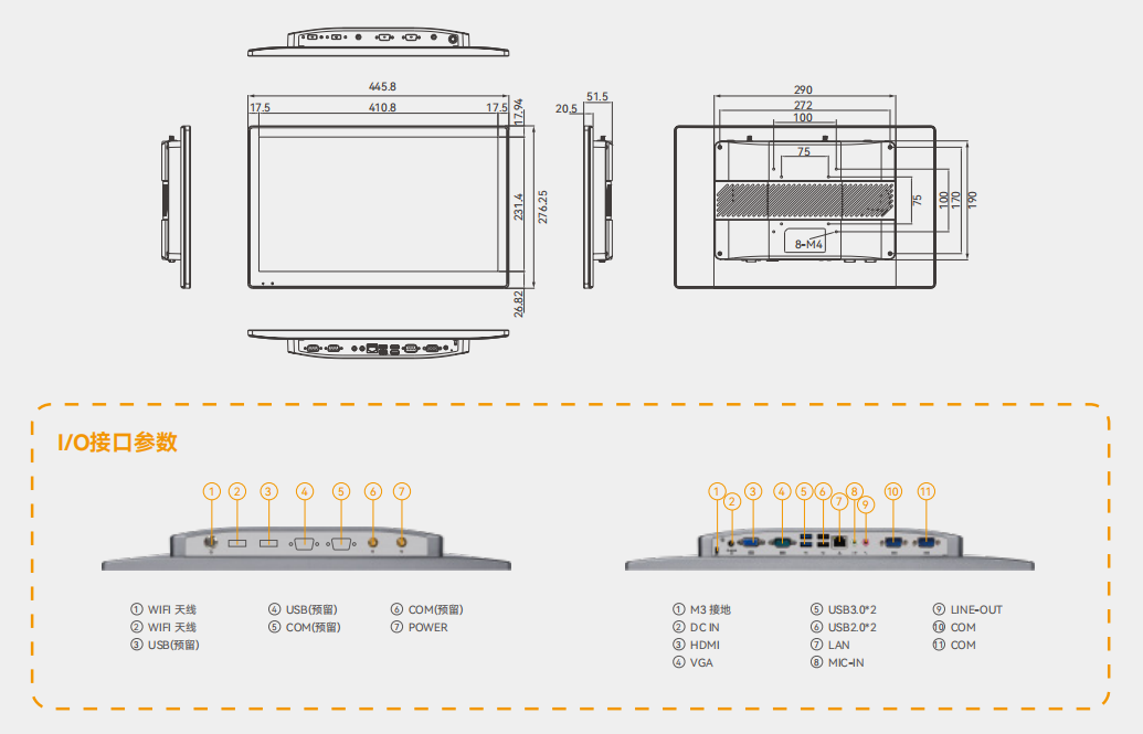 | 下I/O接口 | 1*LINE-OUT端口 1*MIC-IN端口 1*LAN 端口 2*USB2.0端口 2*USB3.0端口 1*VGA端口 1*HDMI端口 1*DC IN端口 2*COM232 1*M3接地螺孔 | 1*LINE-OUT端口 1*MIC-IN端口 1*LAN 端口 2*USB2.0端口 2*USB3.0端口 1*VGA端口 1*HDMI端口 1*DC IN端口 2*COM232 1*M3接地螺孔 | 1*LINE-OUT端口 1*MIC-IN端口 1*LAN 端口 2*USB2.0端口 2*USB3.0端口 1*VGA端口 1*HDMI端口 1*DC IN端口 2*COM232 1*M3接地螺孔 | 1*LINE-OUT端口 1*MIC-IN端口 1*LAN 端口 2*USB2.0端口 2*USB3.0端口 1*COM232端口 1*VGA端口 1*DC IN端口 2*COM232 1*M3接地螺孔 | 1*LINE-OUT端口 1*MIC-IN端口 1*LAN 端口 2*USB2.0端口 2*USB3.0端口 1*COM232端口 1*VGA端口 1*DC IN端口 2*COM232 1*M3接地螺孔 |