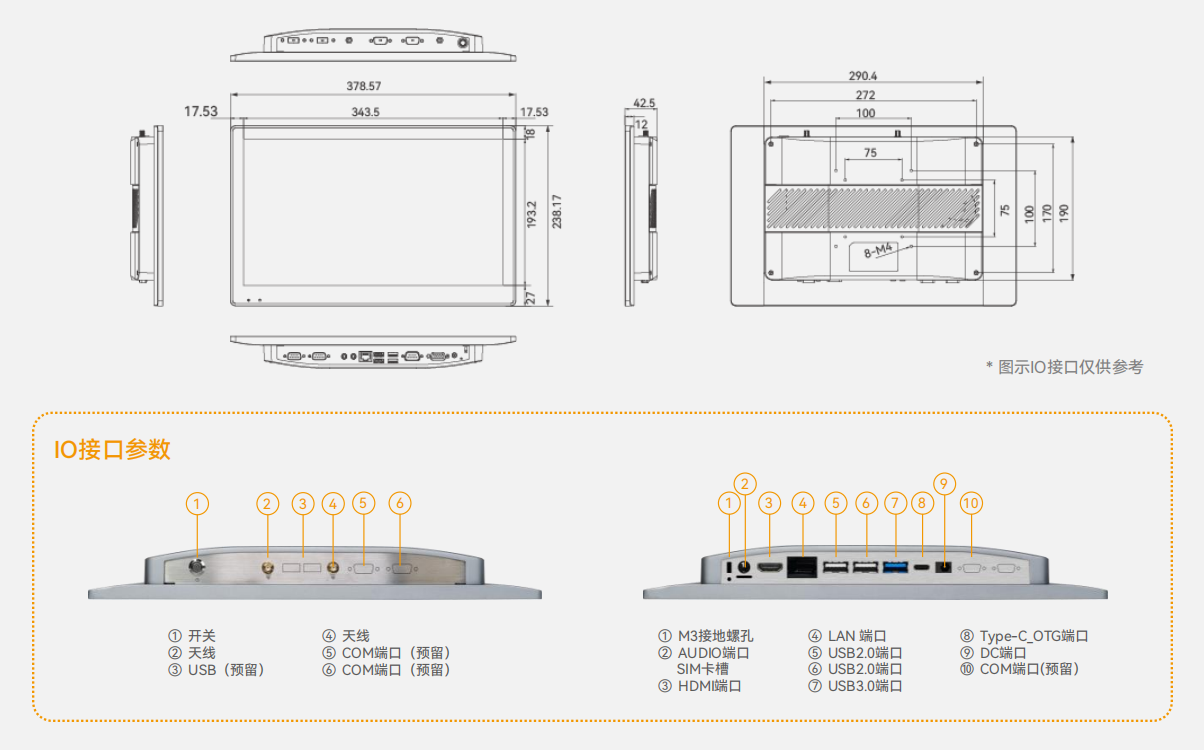 | 上I/O接口 | 1*开关 2*天线 2*COM端口(预留) 2*USB端口(预留) | 下I/O接口 | 1*AUDIO端口 1*SIM卡槽 1*HDMI端口 1*LAN 端口 1*USB2.0端口 1*USB2.0端口 1*USB3.0端口 1*Type-C_OTG端口 1*DC端口 1*COM232端口 1*M3接地螺孔 | ||