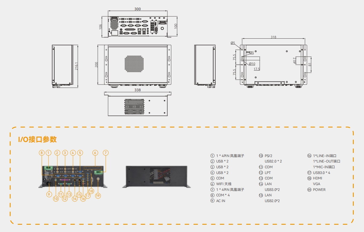 | 前I/O接口 | 1*开机按键(带LED) 4Pin凤凰端子;开关、电源指示灯的引出 1*VGA端口 1*HDMI端口 4*USB3.2端口 6*USB2.0端口 5*COM232端口 4Pin凤凰端子;12V、5V供电 1*LINE-IN端口 1*LINE-OUT端口 1*MIC-IN端口 1*LAN 端口 2*USB2.0端口 1*LAN 端口 2*USB3.2端口 2*COM232端口 1*LPT端口 1*PS/2端口 2*USB2.0端口 1*AC IN端口 1*M3接地螺孔 4*天线 | 1*开机按键(带LED) 4Pin凤凰端子;开关、电源指示灯的引出 1*VGA端口 1*HDMI端口 4*USB3.2端口 6*USB2.0端口 5*COM232端口 4Pin凤凰端子;12V、5V供电 1*LINE-IN端口 1*LINE-OUT端口 1*MIC-IN端口 1*LAN 端口 2*USB2.0端口 1*LAN 端口 2*USB3.2端口 1*COM232端口 1*HDMI端口 1*VGA端口 1*PS/2端口 2*USB2.0端口 1*AC IN端口 1*M3接地螺孔 4*天线 |