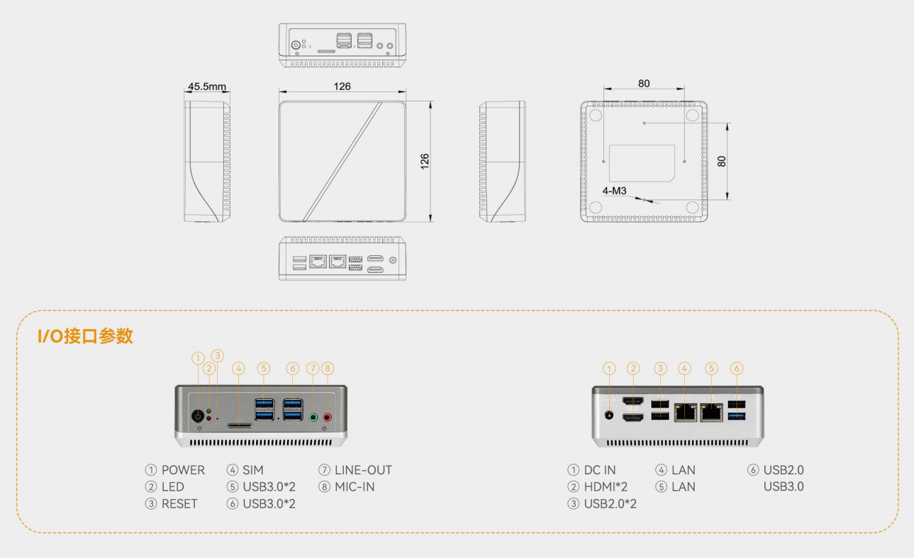 | 后I/O接口 | 1*USB2.0接口 1*USB3.0接口 2*LAN接口 2*USB2.0接口 2*HDMI接口 1*DC IN接口 | 4*USB2.0接口 1*Type-C(Power) 2*LAN接口 1*ghost&cl_cmos button 1*HDMI接口 1*VGA接口(可选) 1*RS232 COM接口(可选) | |||